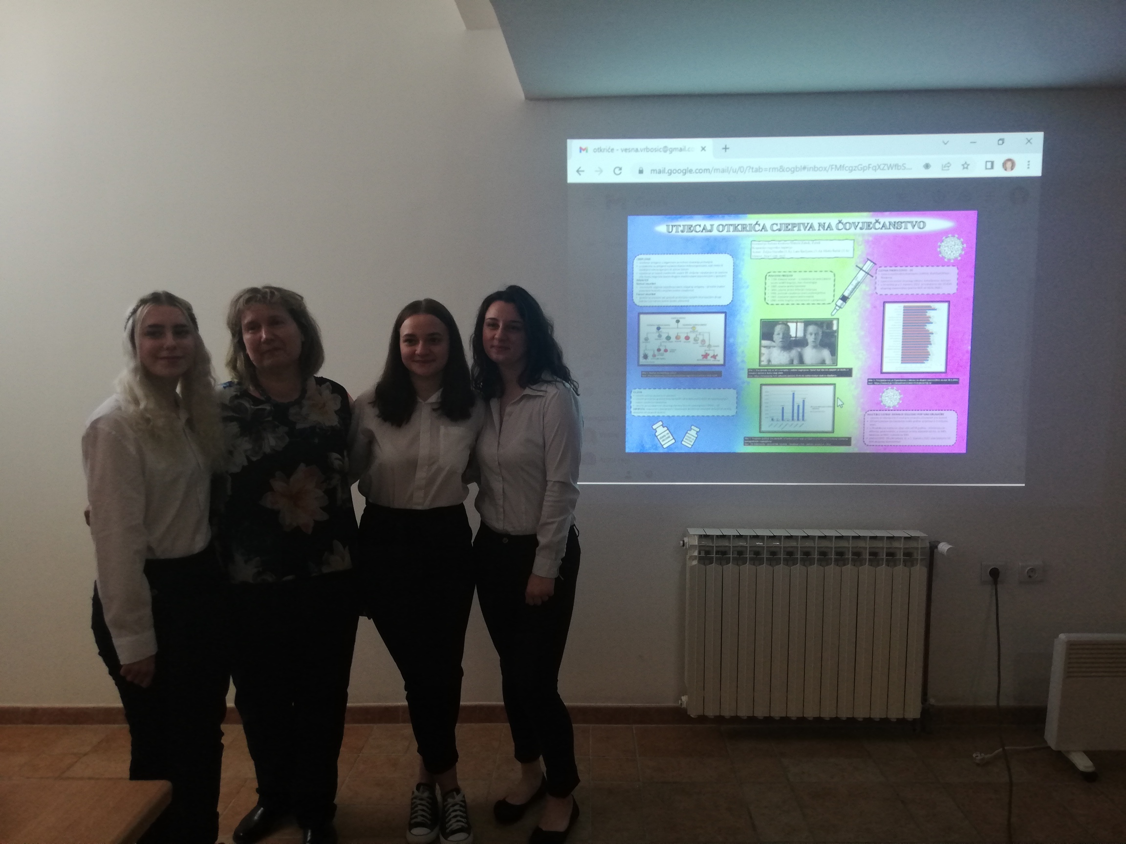 Našu školu predstavio je tim u sastavu: Lara Špoljarec (3.a), Željka Hazulin (3.a) i Marta Šuštić (3.a). Učenice su pod vodstvom mentorice Ana Culej,prof. predstavile poster  na temu “Utjecaj otkrića cjepiva na čovječanstvo”.