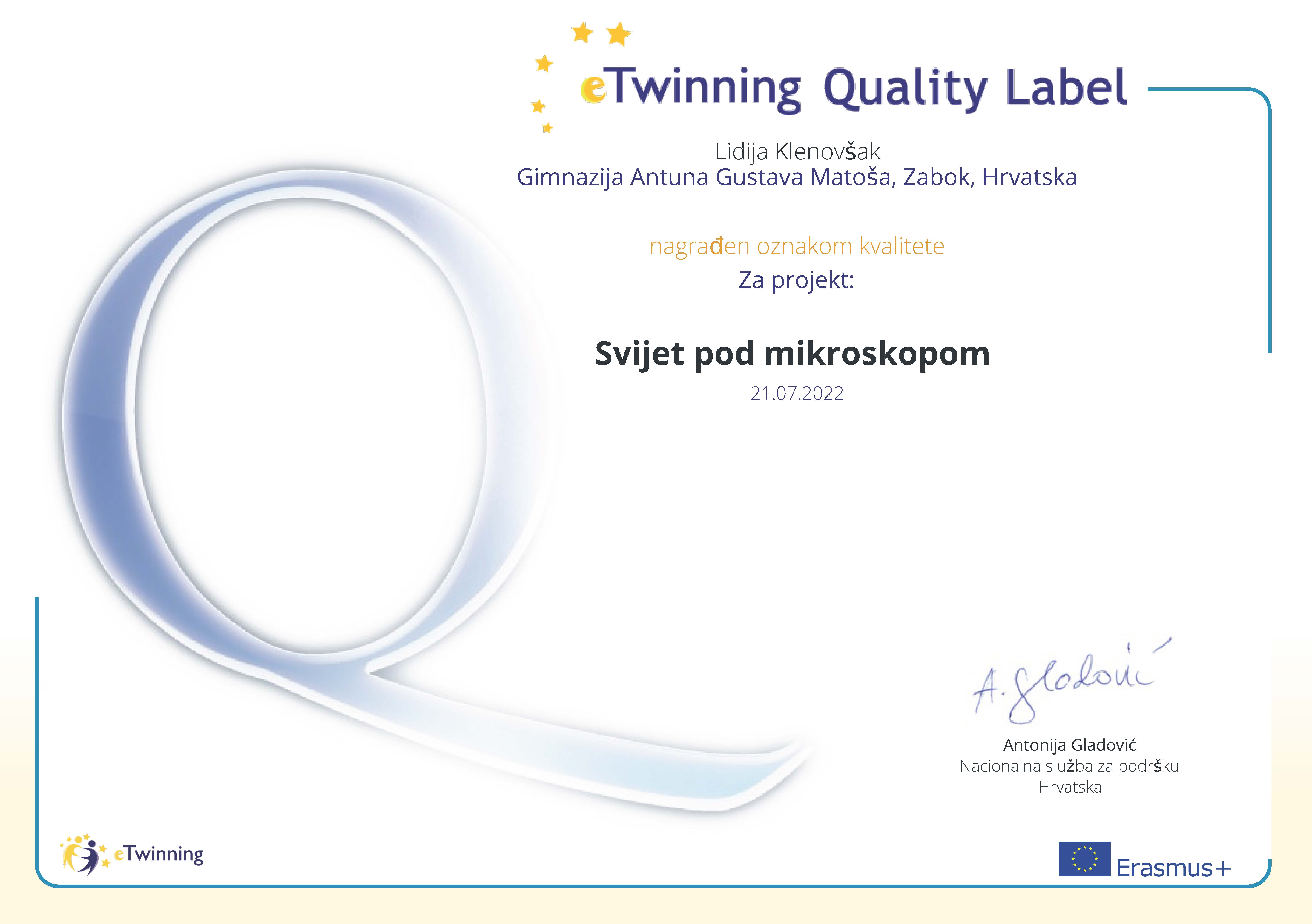 Čast nam je obavijestiti Vas da je naša škola nagrađena Europskom oznakom kvalitete za izvrsnost rada u eTwinning projektu „Svijet pod mikroskopom“.