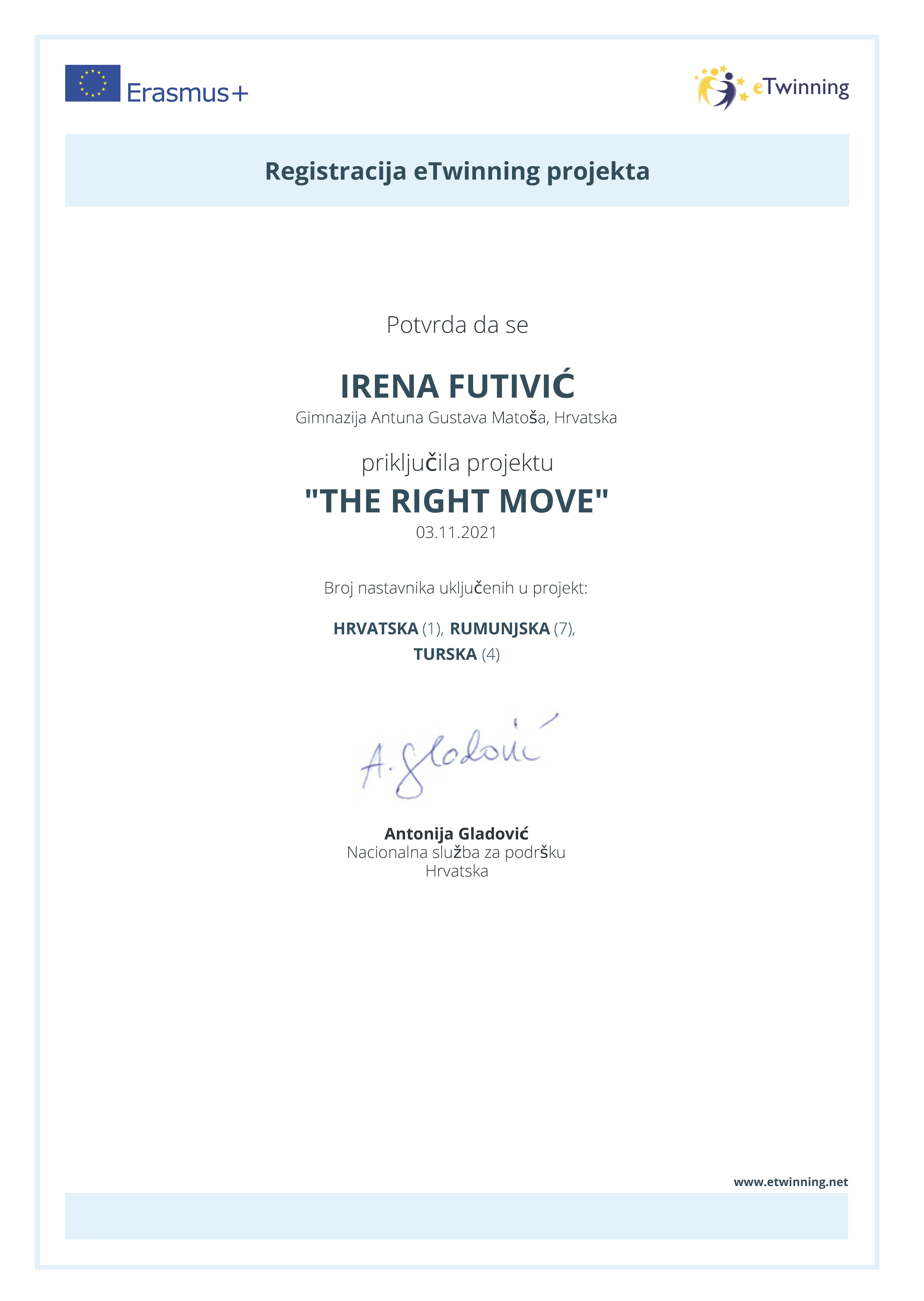 Međunarodni projekt „The right move“ započeo je u studenom 2021. godine. U projektu sudjeluju učenici 3.a razreda, a to su: Sebastian Klancir, Lara Špoljarec i Angelina Piljek. Cilj projekta je razvijanje i jačanje kognitivnih vještina kod učenika. Središnje aktivnosti projekta ostvaruju se u mješovitim skupinama koje zahtijevaju komunikaciju na engleskom jeziku i snalaženje u rješavanju problemskih zadataka.