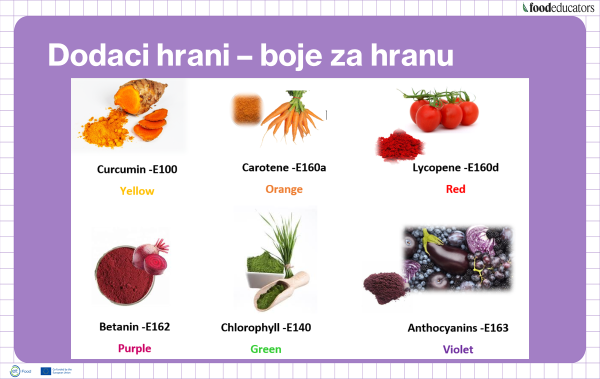 Dodaci hrane (aditivi)su tvari koje se dodaju hrani da bi proizvod mogao duže sačuvati osnovna svojstva okusa, mirisa i konzistencije. E brojevi označavaju prehrambene aditive čija je upotreba dozvoljena u Europi. ( boja kukurmin =E100, vitamin C=E300).
