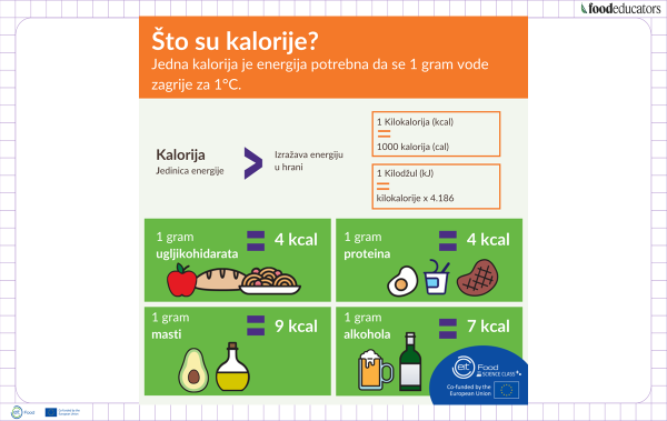 Učenici koji sudjeluju u projektu su naučili računati kalorijsku vrijednost hrane. Kalorijsku vrijednost računamo tako da gram ugljikohidrata i proteina pomnožimo s 4, a gram masti pomnožimo s 9.