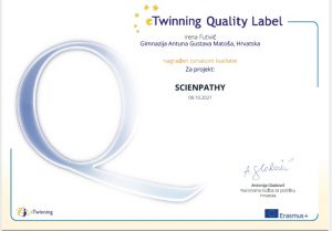 Još jedan od eTwinning projekata u kojem smo sudjelovali od ožujka do lipnja 2021. – Projekt SCIENPATHY – dobio je  oznaku kvalitete što znači da tijekom provedbe u školi dosegao određenu razinu provedbe prema zadanim kriterijima. Jedan od važnih kriterija je međusobna suradnja učenika, te korištenje IKT tehnologija za ostvarenje ciljeva projekta.