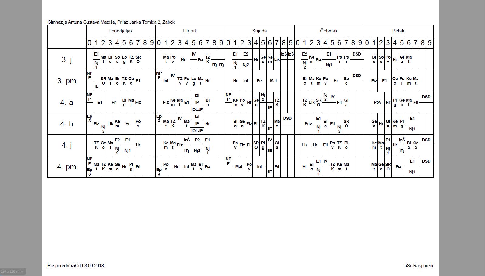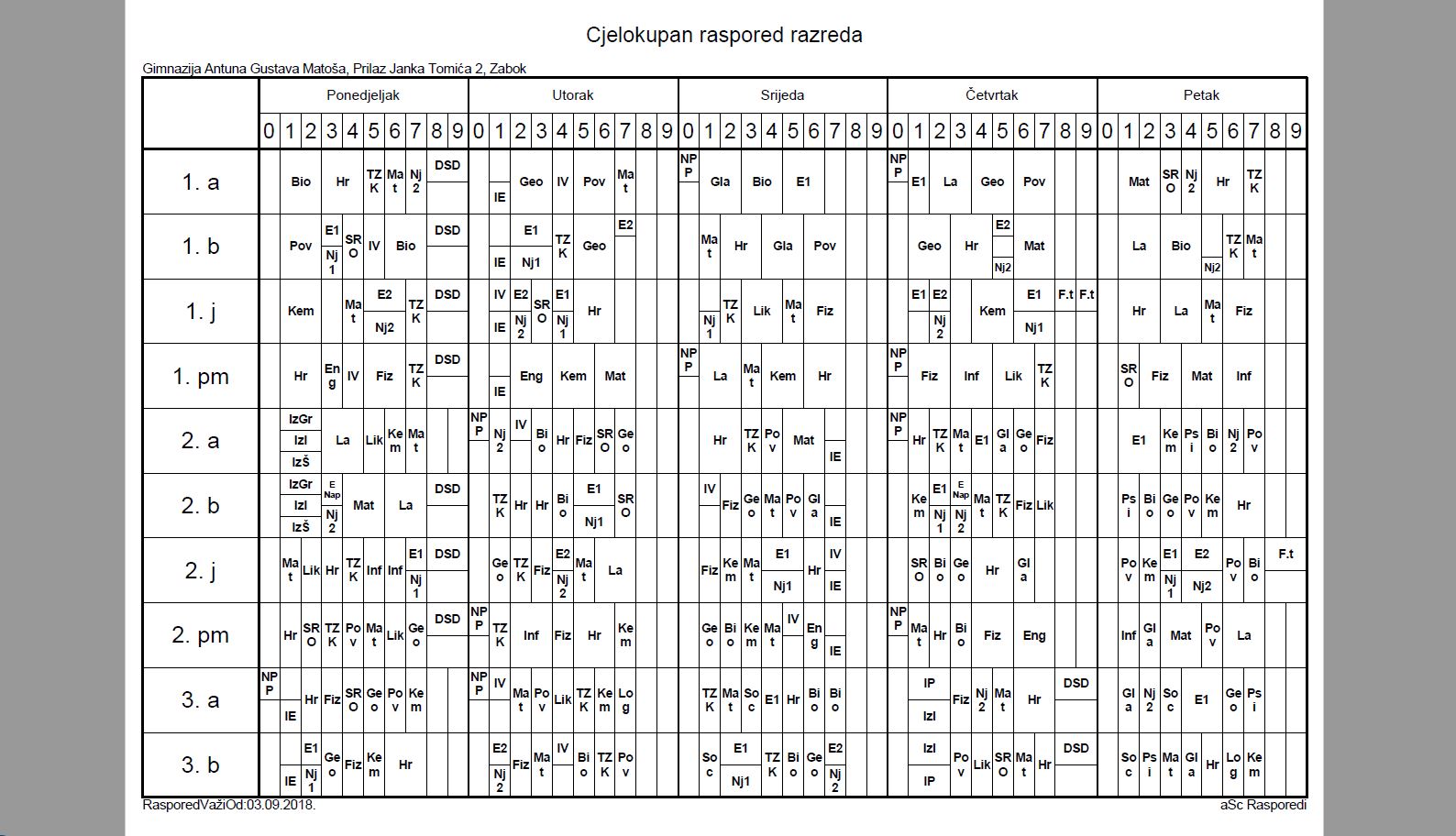 Raspored sati možete pronaći ovdje (strana 1, strana 2), a možete mu pristupiti i na Edupage-u škole.