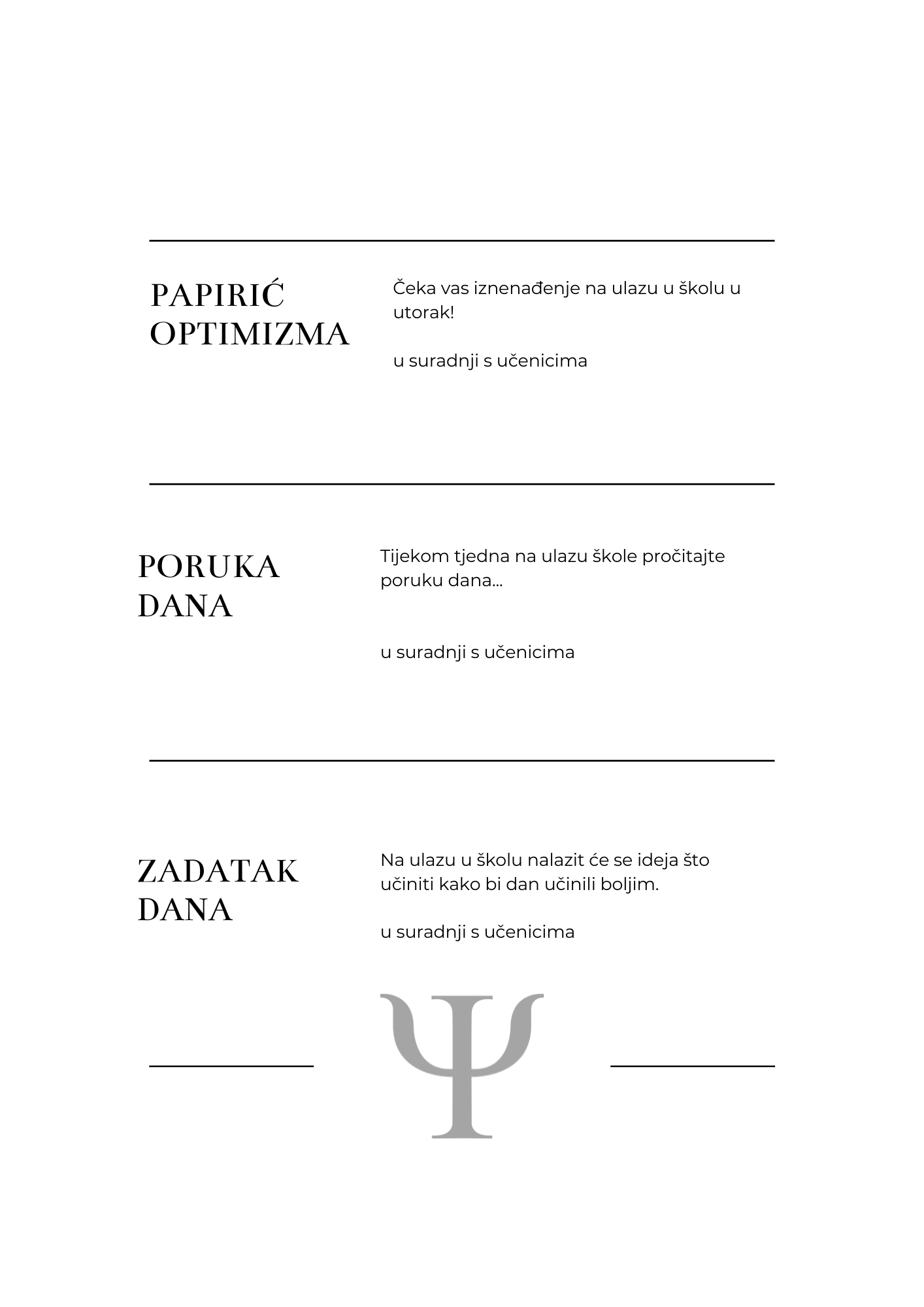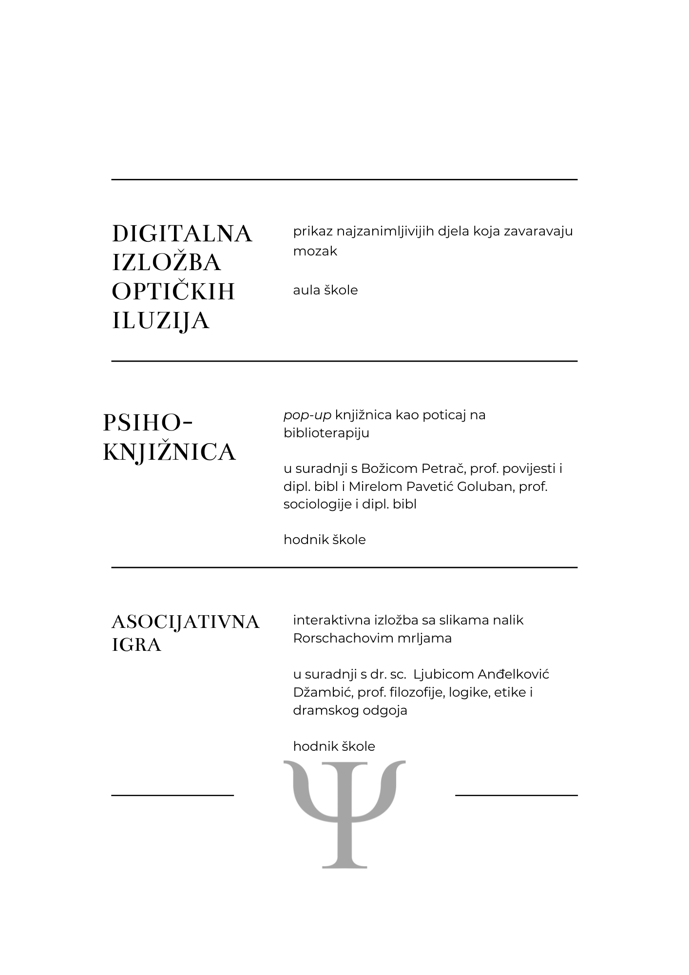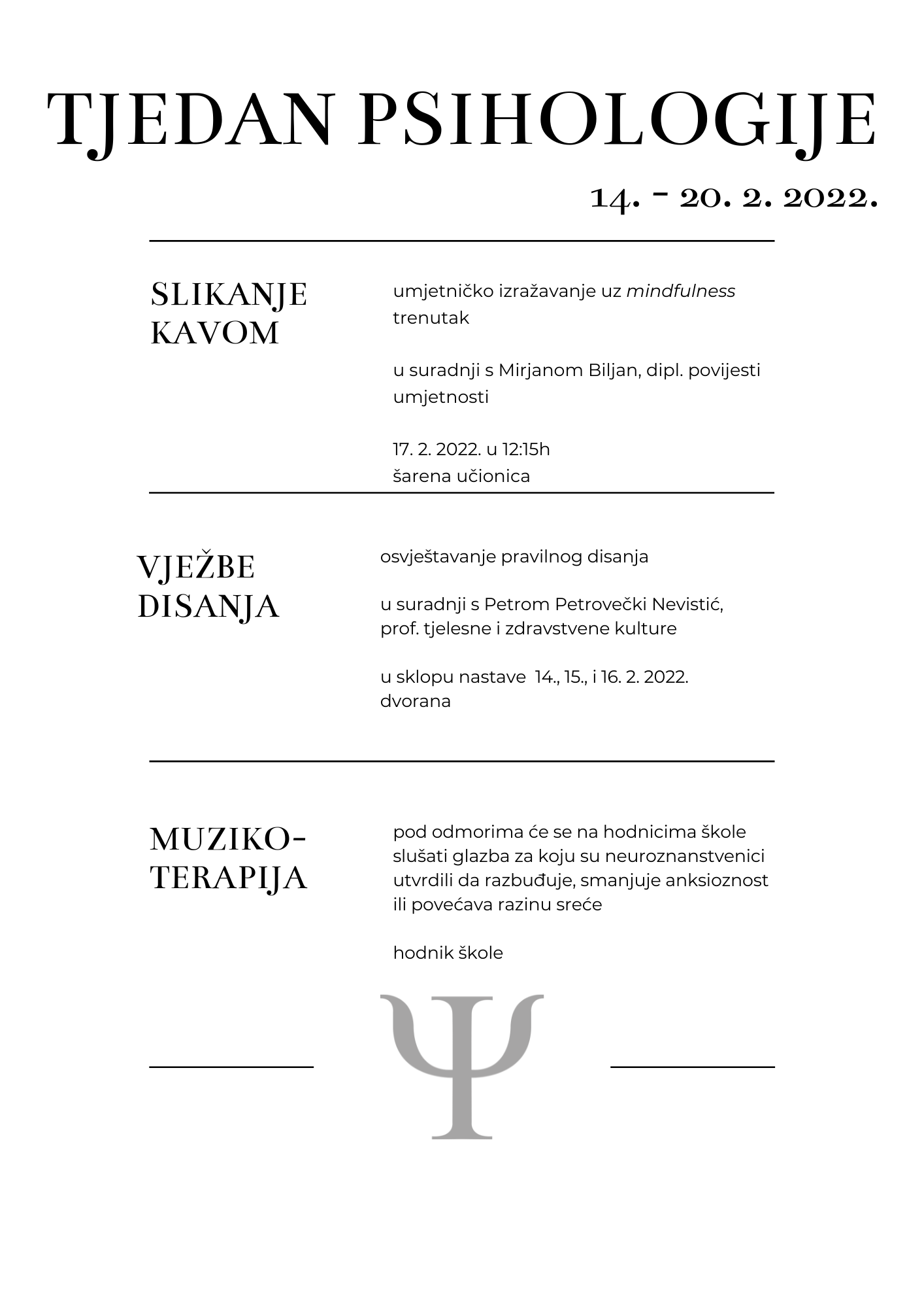 U Hrvatskoj se od 14. do 20. veljače 2022. održava 15. Tjedan psihologije.  Na inicijativu školskih psihologinja obilježit će se i u našoj školi. U pripremu programa uključilo se nekoliko predmetnih nastavnika te učenici koji pohađaju izbornu nastavu psihologije. Program donosimo u nastavku. Uključite se!