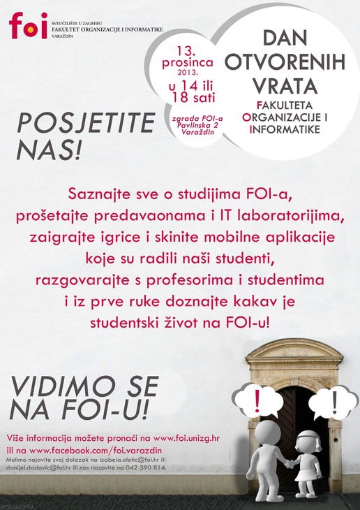 Fakultet organizacije i informatike Sveučilišta u Zagrebupetak 13. prosinca 2013. godine organizira DAN OTVORENIH VRATA. Vrata FOI-a bit će otvorena u dva termina, od 14 i od 18 sati.