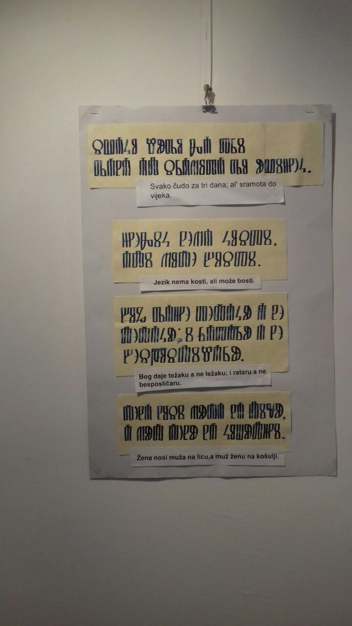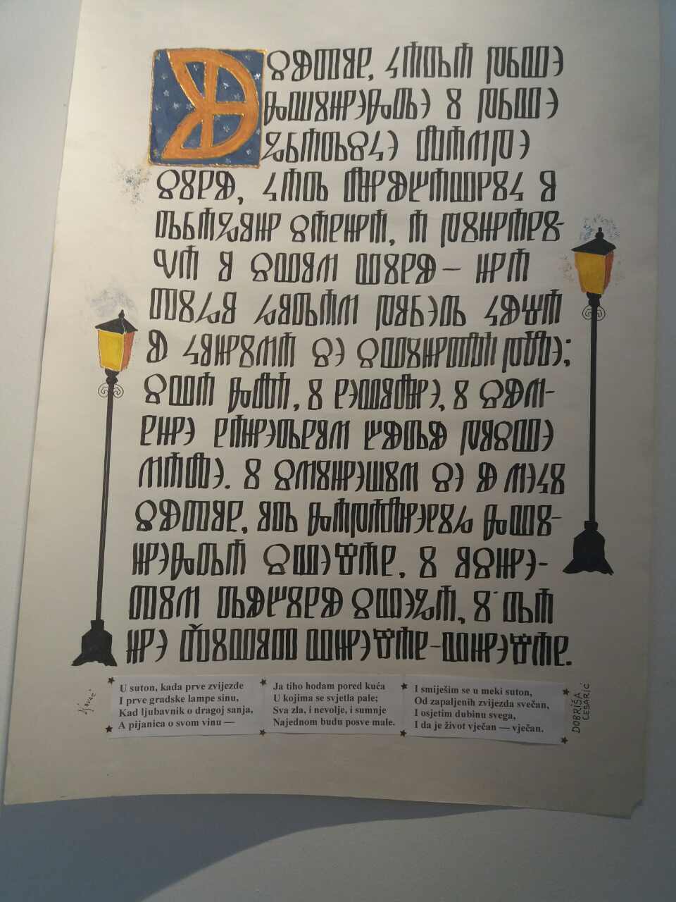 Izložba uključuje i radove iz umjetničke radionice slikarice i keramičarke Verice Kovač – glagoljička slova kao skulpture od 20 cm. Budući da se slikarica bavi i kaligrafskim radom, izloženi su i stihovi Cesarićevih pjesama napisanih glagoljicom. Posjet izložbi izvrsna je prilika da se podsjetimo kako hrvatski narod stoljećima ima svoj jezik, svoje pismo i svoju knjigu te da je jezik bitna odrednica naroda i identiteta. Izložba je otvorena do 24. ožujka.