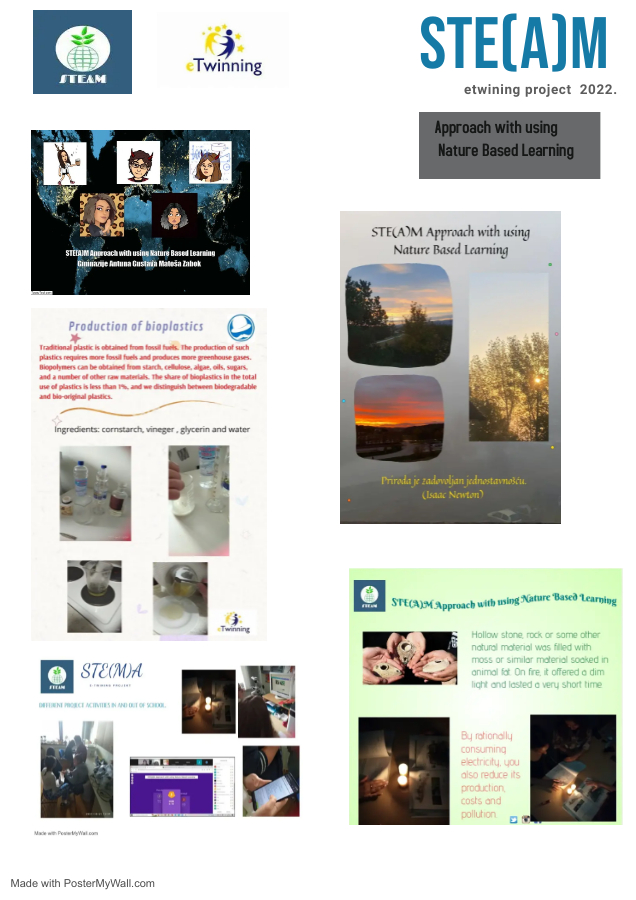 Tijekom projekta učenici su izradili plakate i prezentacije prema uputama i zadanim projektnim temama, a posebno možemo istaknuti izradu bio plastike. Ovaj projekt omogućio je učenicima stjecanje vještine korištenja digitalnih alata te istraživanja na temu očuvanja prirode. Posebno je bilo interesantno korištenje alata Zumpad-a u kojem je svaki učenik napisao rečenicu na temu očuvanja prirode koja je započela određenim slovom. Rezultat ove aktivnosti bio je akrostih pjesme ‘OUR STEAM PROJECT İS NATURE BASED LEARNİNG’ što možete vidjeti na poveznici https://bit.ly/3y3gde2