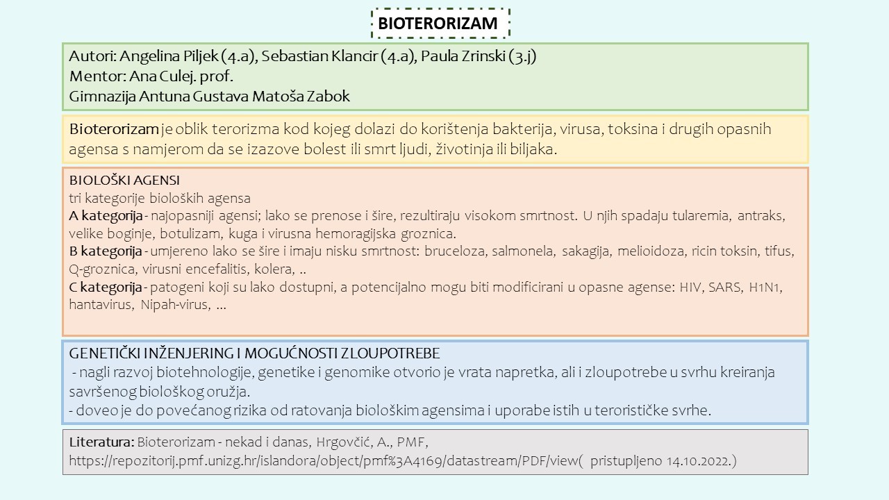 Učenici su upoznali što je bioterorizam, povijest bioterorizma, te su navodili  primjere poznatih slučajeva bioterorizma.