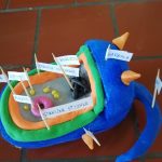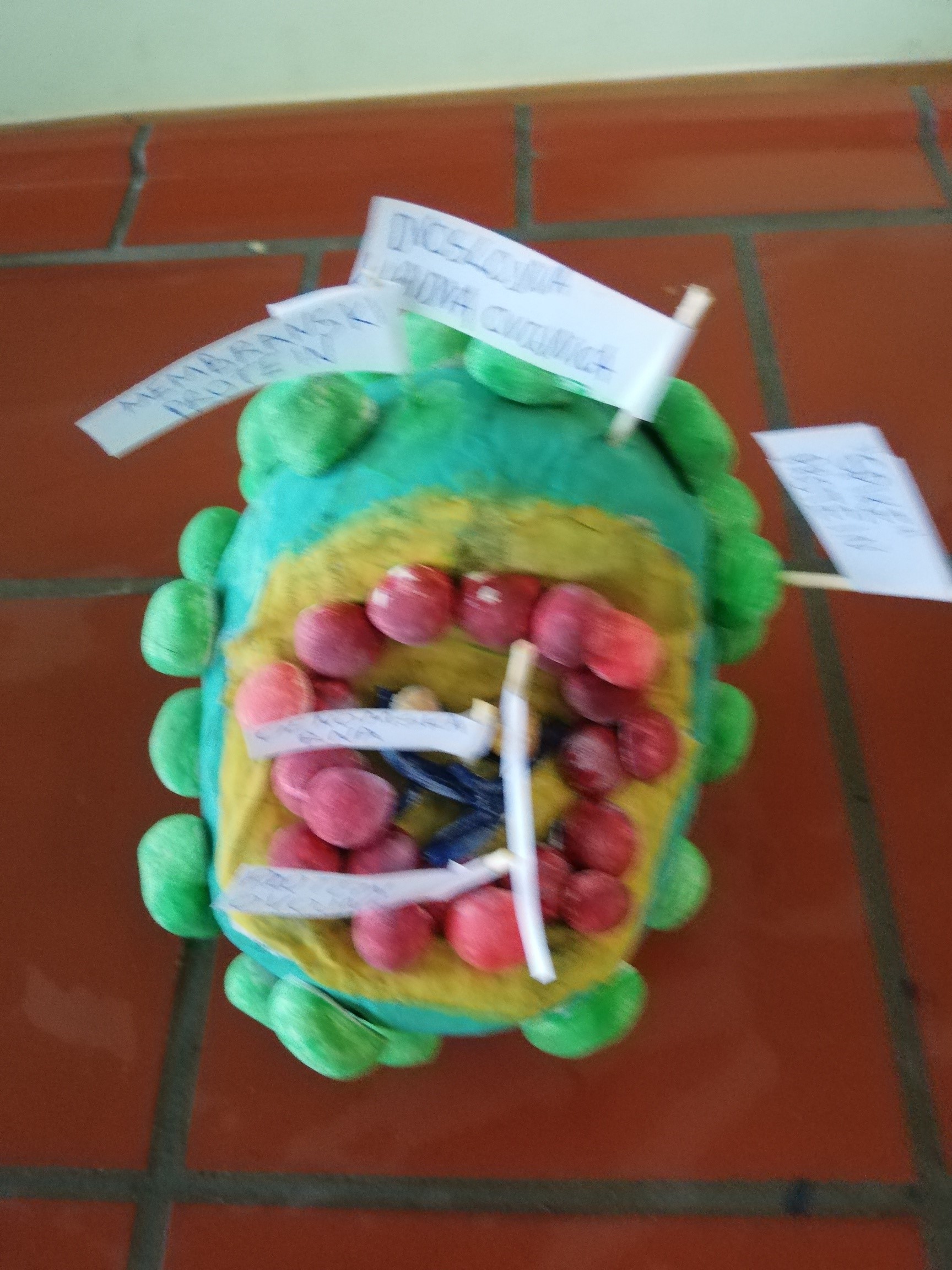 • Postupak: Stare novine sam zgužvala u loptu i učvrstila krep trakom. Izrezala sam četvrtinu te lopte te ju zatim obložila novinama i ljepilom (kaširanje), a nakon toga ju obojala. Dok se boja sušila, od izmrvljenog kartona pomiješanog s ljepilom sam oblikovala glikoproteinske izbojke te sam i njih obojala. Zabila sam ih u kuglu. Potom sam na špagu naslagala perlice i špagete oblikovala u ‘čuperak’.