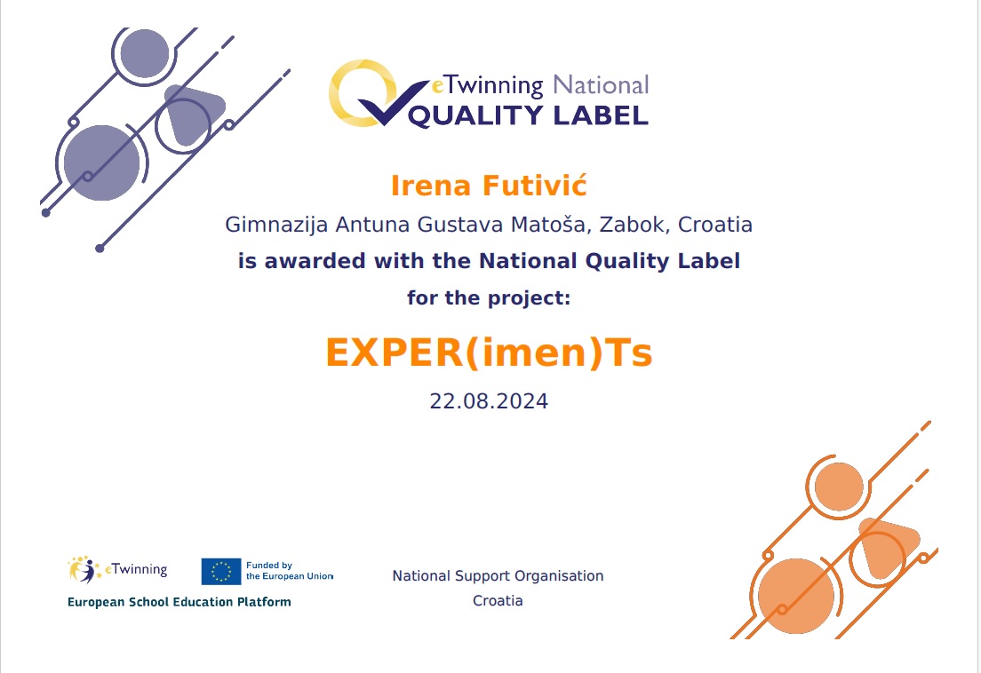 Međunarodni projekt “Experiments” imao je za cilj izvođenja pokusa na nastavi kemije i tako motivirati učenike za ovaj predmet. Učenici će izvoditi pokuse, objašnjavat će ih, snimati i opisivati te će tako proširiti svoja znanja iz kemije. Sudionici projekta bili su učenici i nastavnici iz Grčke, Francuske, Jordana, Moldavije, Makedonije, Poljske, Turske i Hrvatske. Iz naše škole sudjelovali su učenici 2b razreda Darija Kotarski, Jana Jambrečina, Tihana Vorih, Marta Reljić i Anamari Mešnjak, a mentorica je bila Irena Futivić.