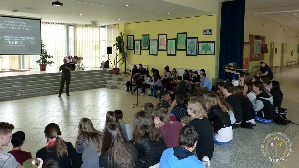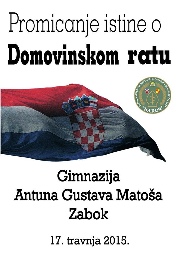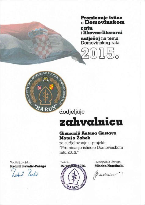 Naša Gimnazija je 15.veljače 2016. godine primila zahvalnicu za sudjelovanje u projektu ”Promicanje istine o Domovinskom ratu i likovno-literarni natječaj” koji provodi Udruga veterana specijalne policije Domovinskog rata ”Barun”. Svečana dodjela održana je u Gradskoj knjižnici u Zaboku, a za glazbene točke bila je zadužena Lana Petrovečki. Naši maturanti, pod vodstvom profesorica povijesti Božice Petrač i Ines Lisak, su 17.4.2015.g. slušali predavanje predstavnika Udruge o sudjelovanju u Domovinskom ratu, postavili im zanimljiva pitanja i dali odgovore na pitanje ”Tko je hrvatski branitelj?”