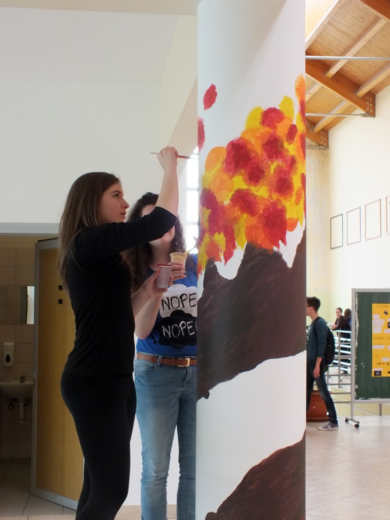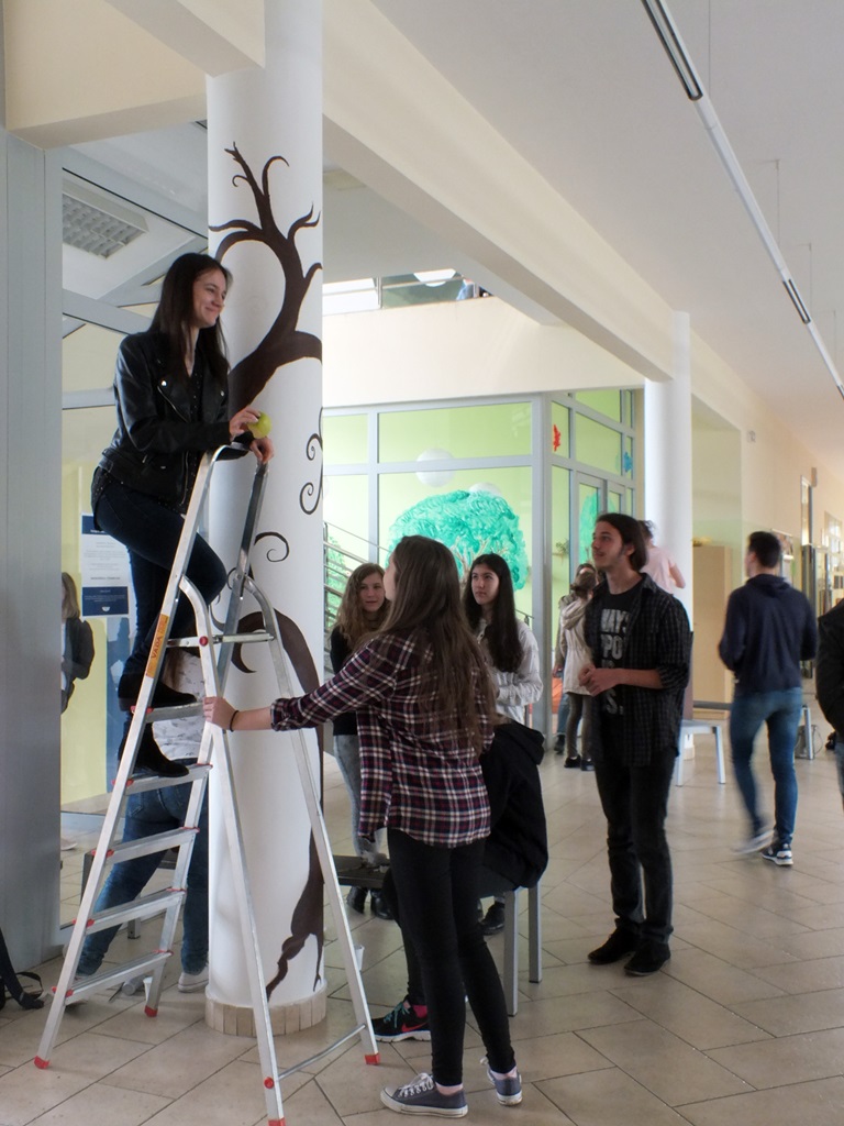 U srijedu, 11. svibnja 2016. učenici likovne grupe pod vodstvom prof. Ivane Molnar oslikavali su stupove škole pod nazivom „Drvo kroz godišnja doba“.