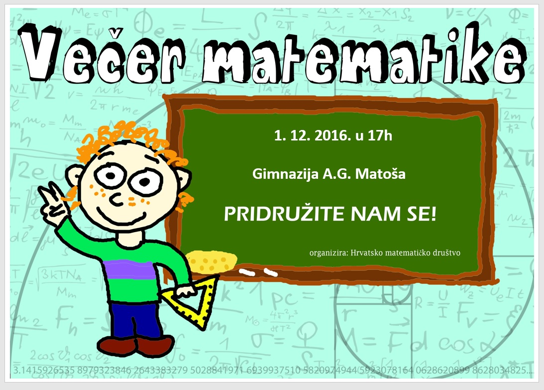 Sve zainteresirane učenike i građanstvo pozivamo na Večer matematike koja se odvija u prostoru naše škole u organizaciji Hrvatskog matematičkog društva i naših kolega.