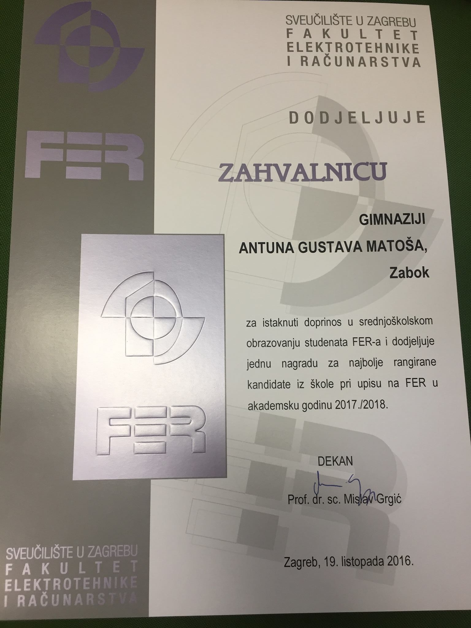 Gimnazija Antuna Gustava Matoša  je i ove školske godine dobila zahvalnicu za istaknuti doprinos u srednjoškolskom obrazovanju studenata FER-a, kao škola s jednima od najbolje rangiranih kandidata pri upisu na FER u akademsku godinu 2017./2018.